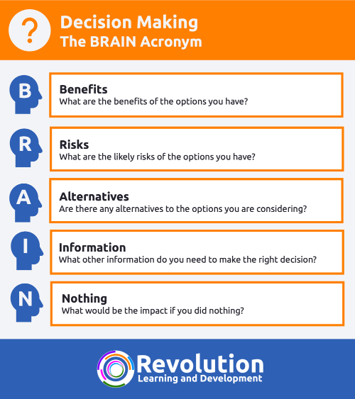 Using the BRAIN Decision Making Acronym or another tool to help with decision making will help you to make more informed decisions, rather than jumping into decisions and having to make corrections later.