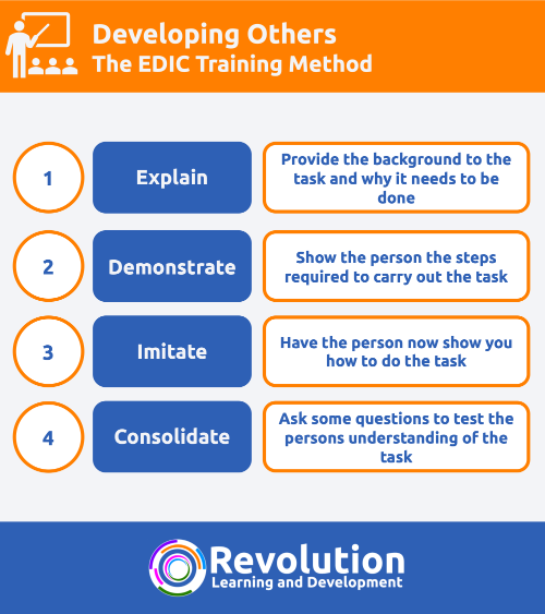 The EDIC Training Method is a way of quickly and easily training someone else to conduct a task. It is mainly used for more process-oriented training and not soft-skills training.